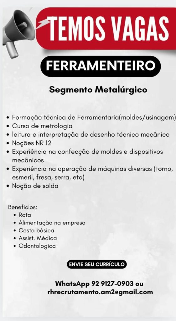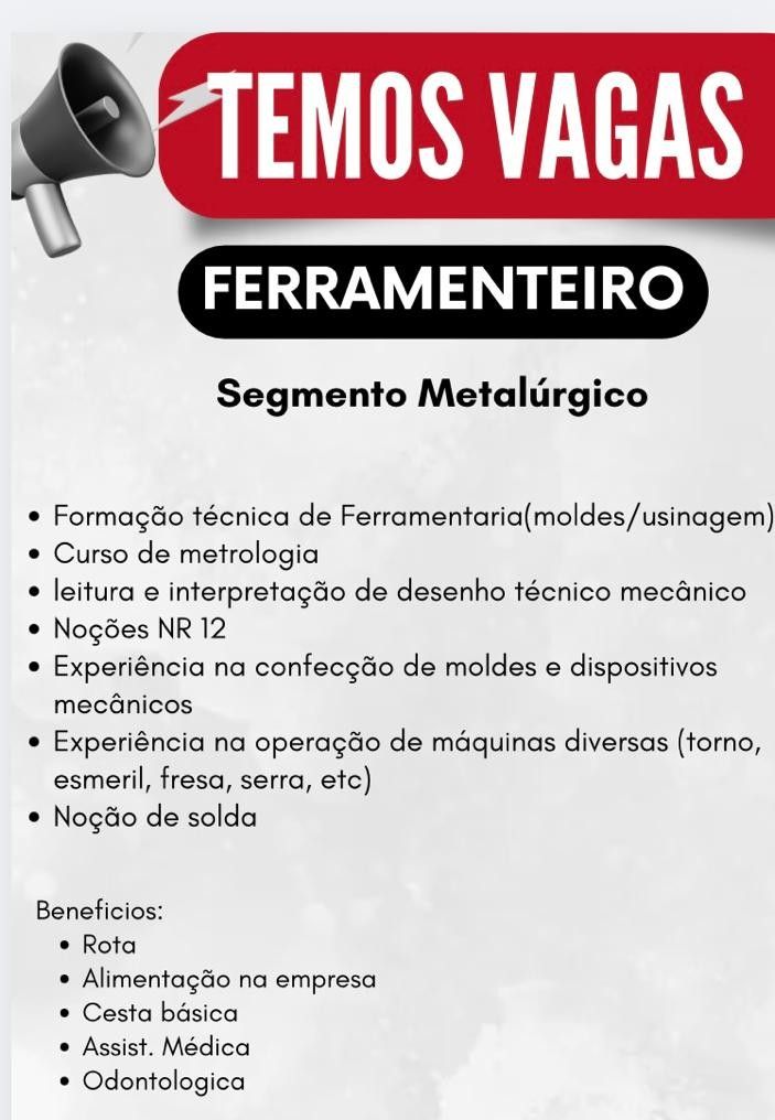 Seleção para vaga de Ferramenteiro; Envie seu currículo!