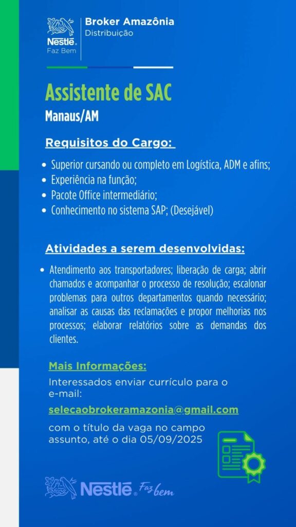 O processo seletivo para esta(s) vaga(s) não cobra absolutamente nada pela sua candidatura. Portanto, jamais aceite qualquer tipo de cobrança para cadastrar seu currículo.