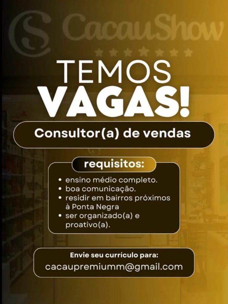 Cacau show está selecionando Consultor (a) de vendas; Envie seu currículo!