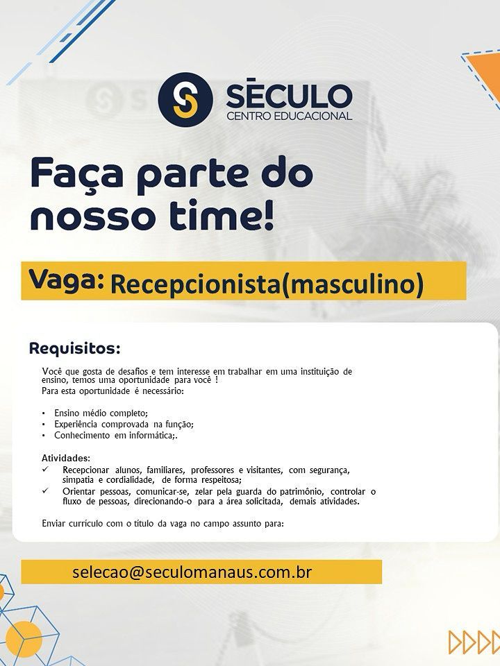 Centro educacional século seleciona Recepcionista; Envie seu currículo!