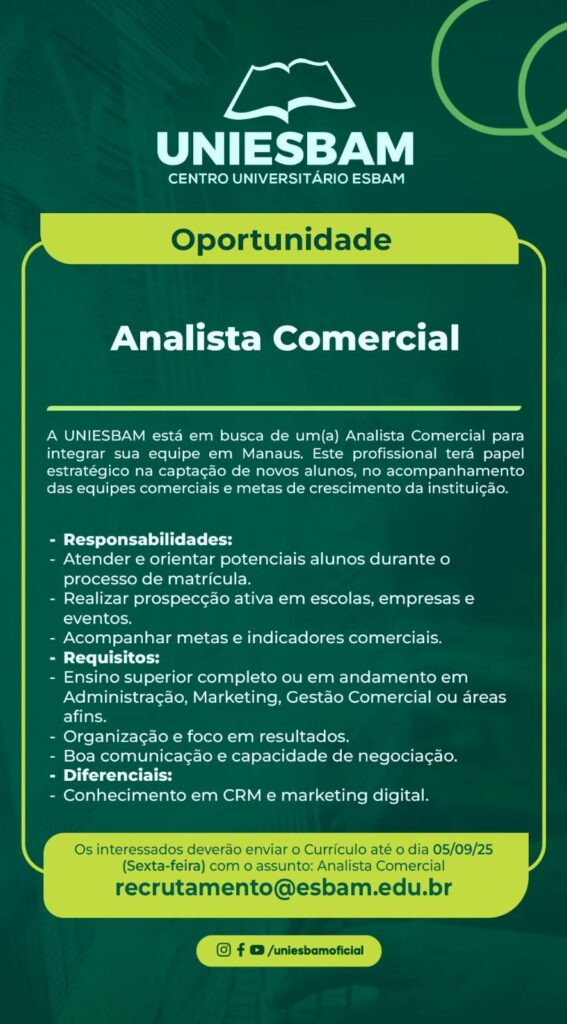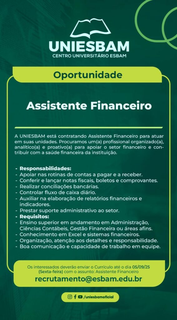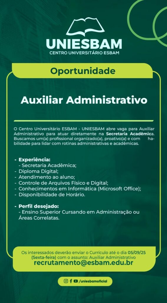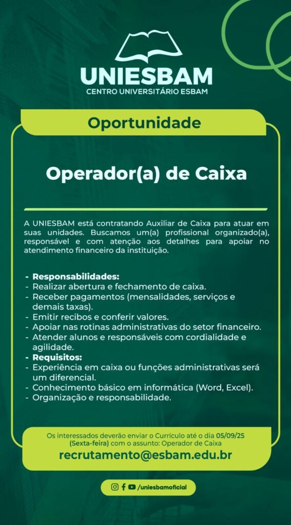 Centro Universitário Esbam está selecionando Operador (a) de caixa e mais 03 cargos; Envie seu currículo!