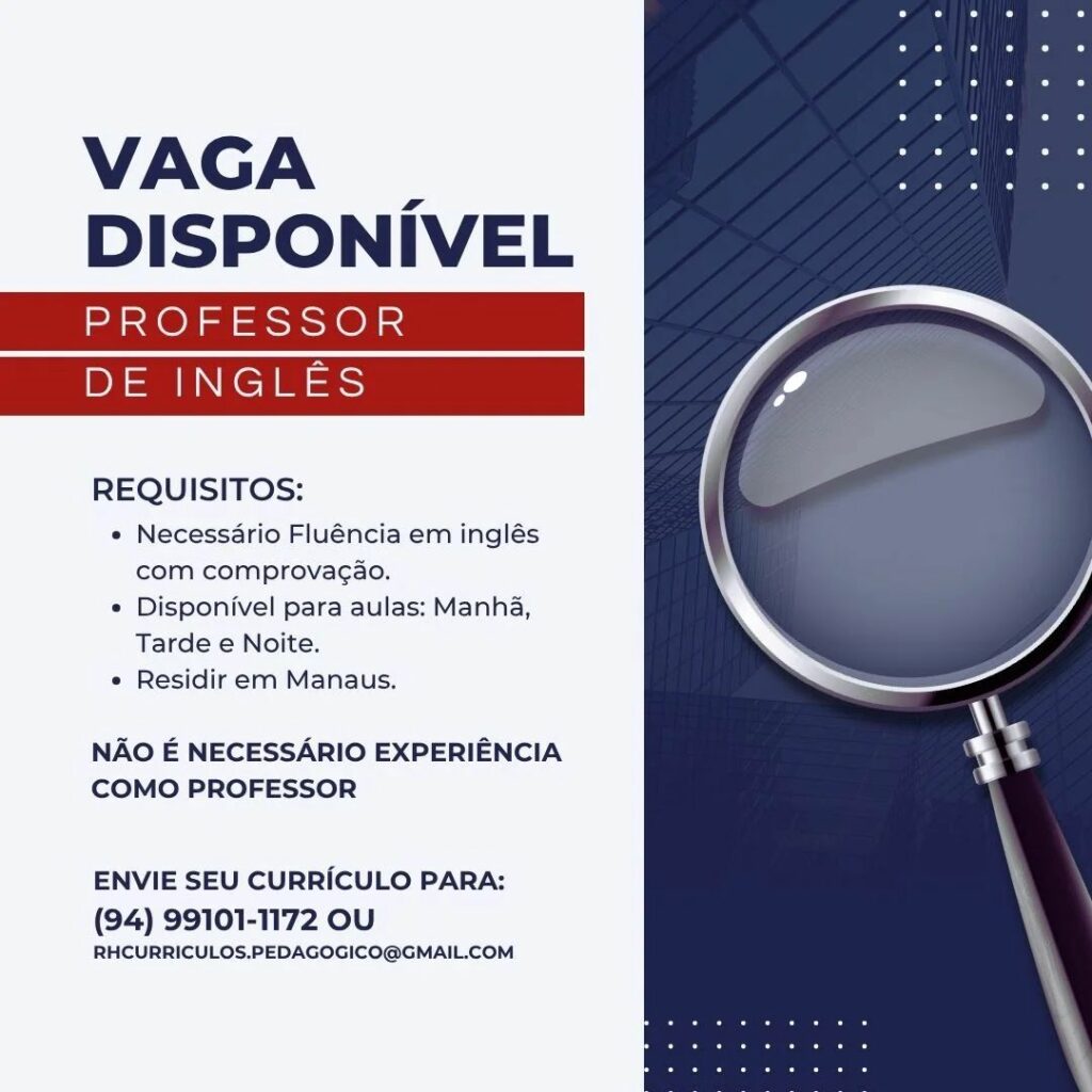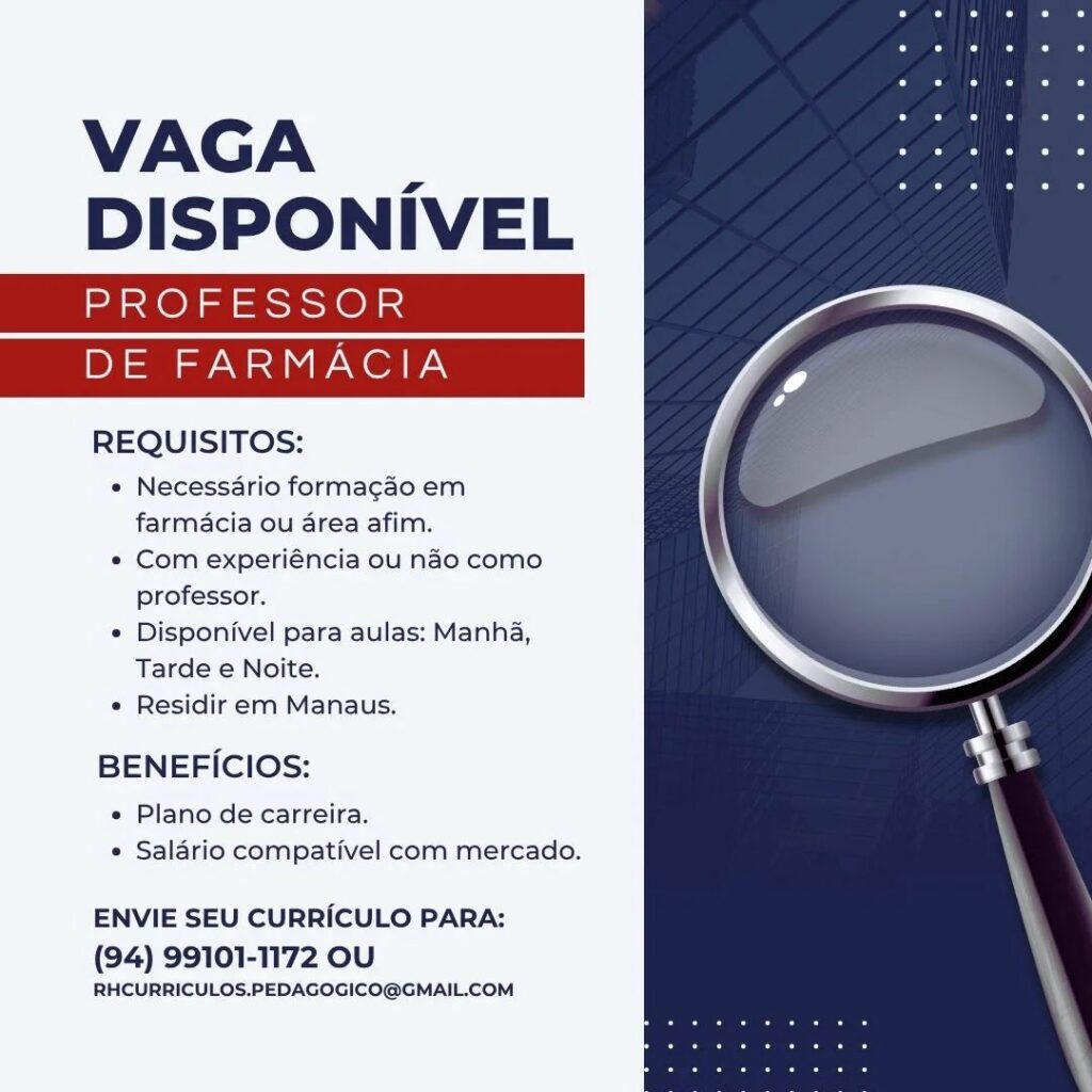 Com ou sem experiência! Seleção para seguintes vagas Professor de inglês, Professor de farmácia; Envie seu currículo!