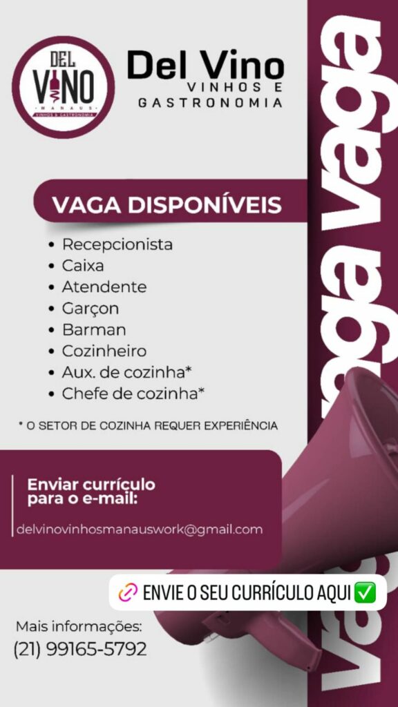 Del vino vinhos e gastronomia seleciona Recepcionista, Caixa, Atendente, Garçom, Barman, Cozinheiro, Auxiliar de cozinha, Chefe de cozinha; Envie seu currículo!