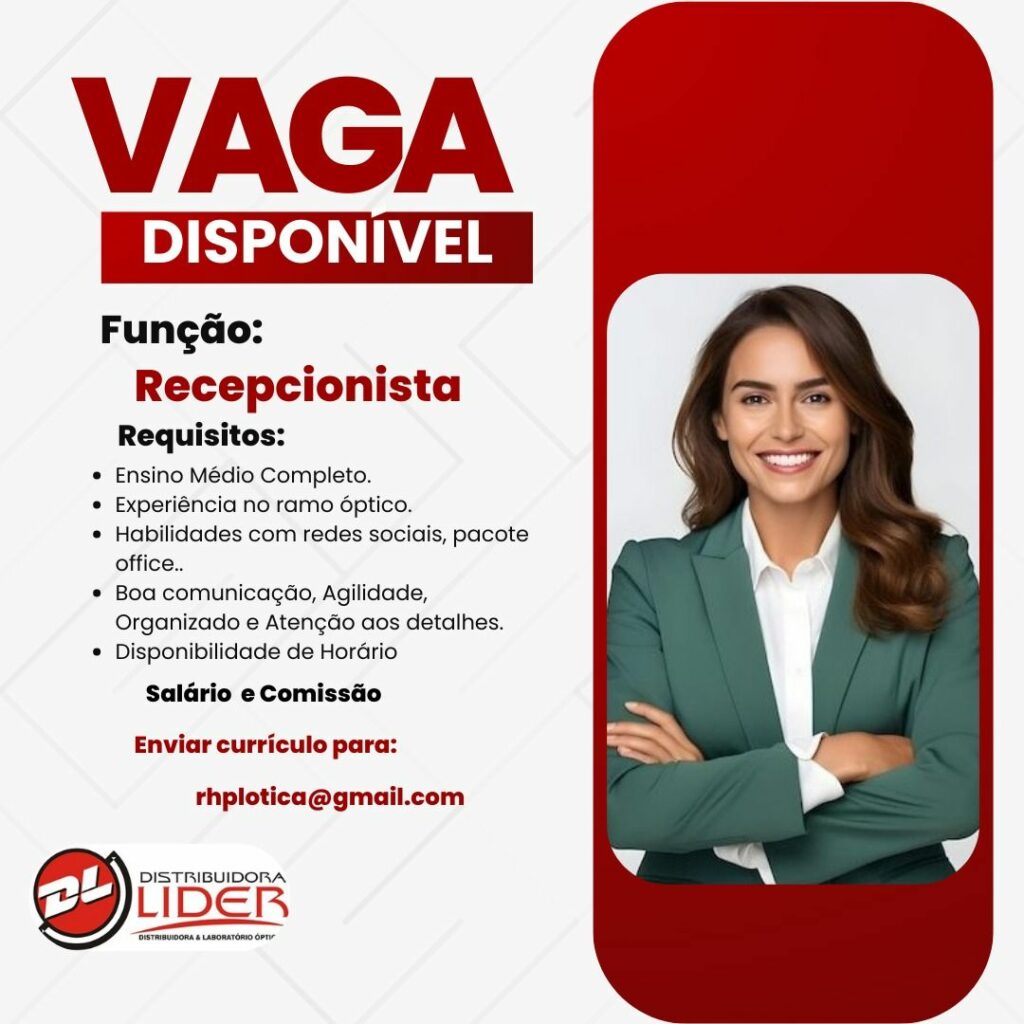 Distribuidora Líder está selecionando Recepcionista; Envie seu currículo!