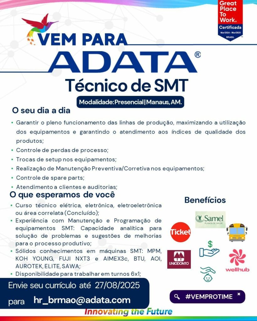 Empresa Adata está selecionando Técnico de smt; Envie seu currículo!