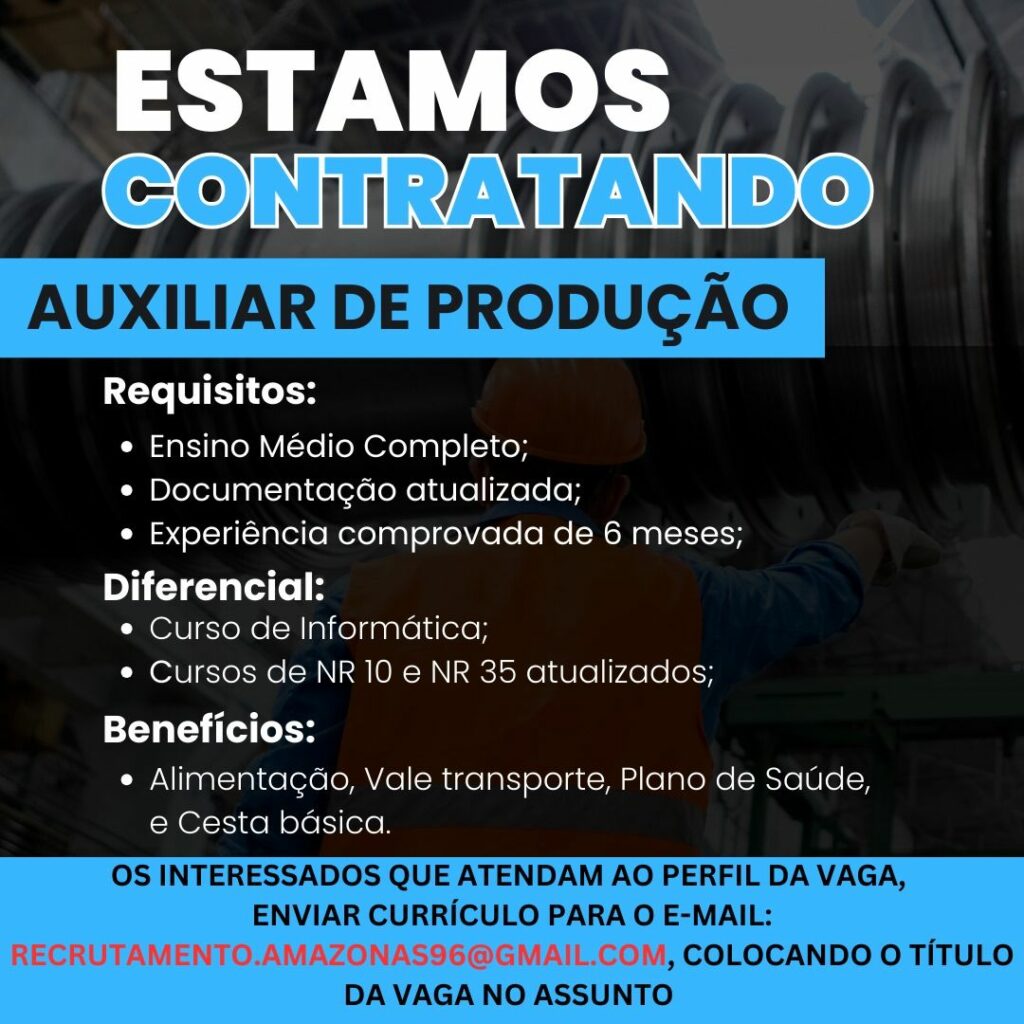 Empresa de grande porte está selecionando Auxiliar de produção; Envie seu currículo!