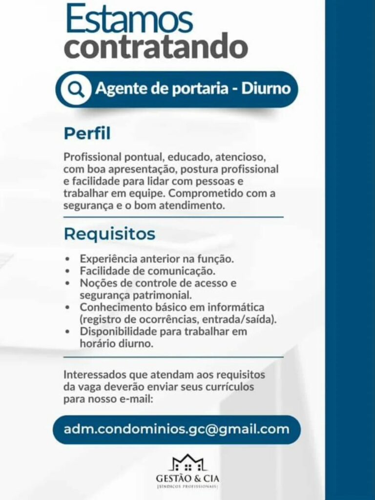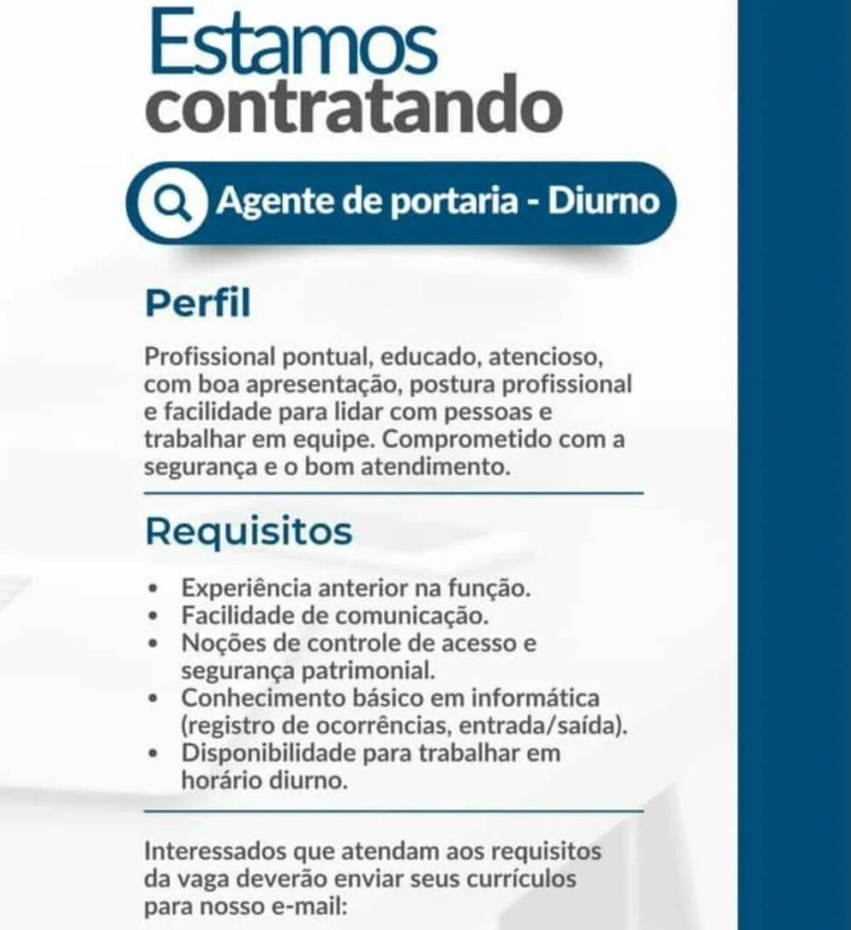 Empresa está selecionando Agente de portaria; Envie seu currículo!