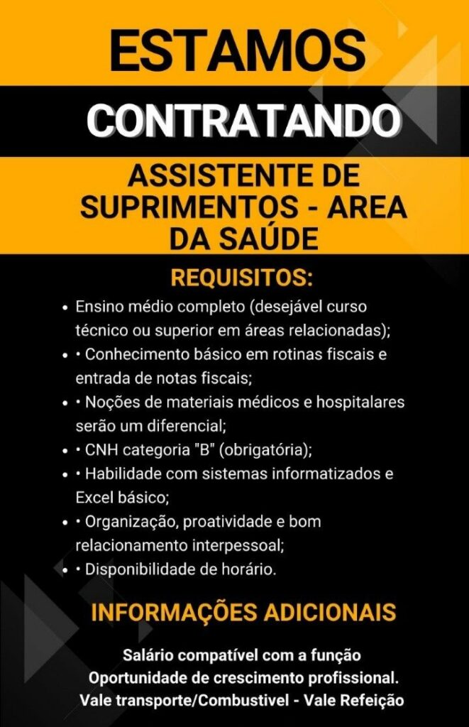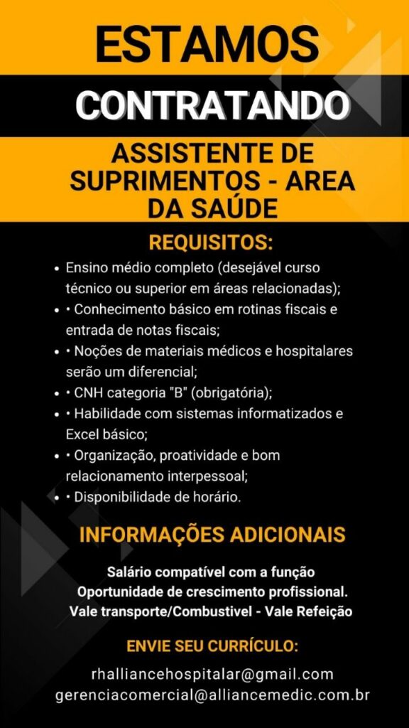 Empresa está selecionando Assistente de Suprimentos área da saúde; Envie seu currículo!