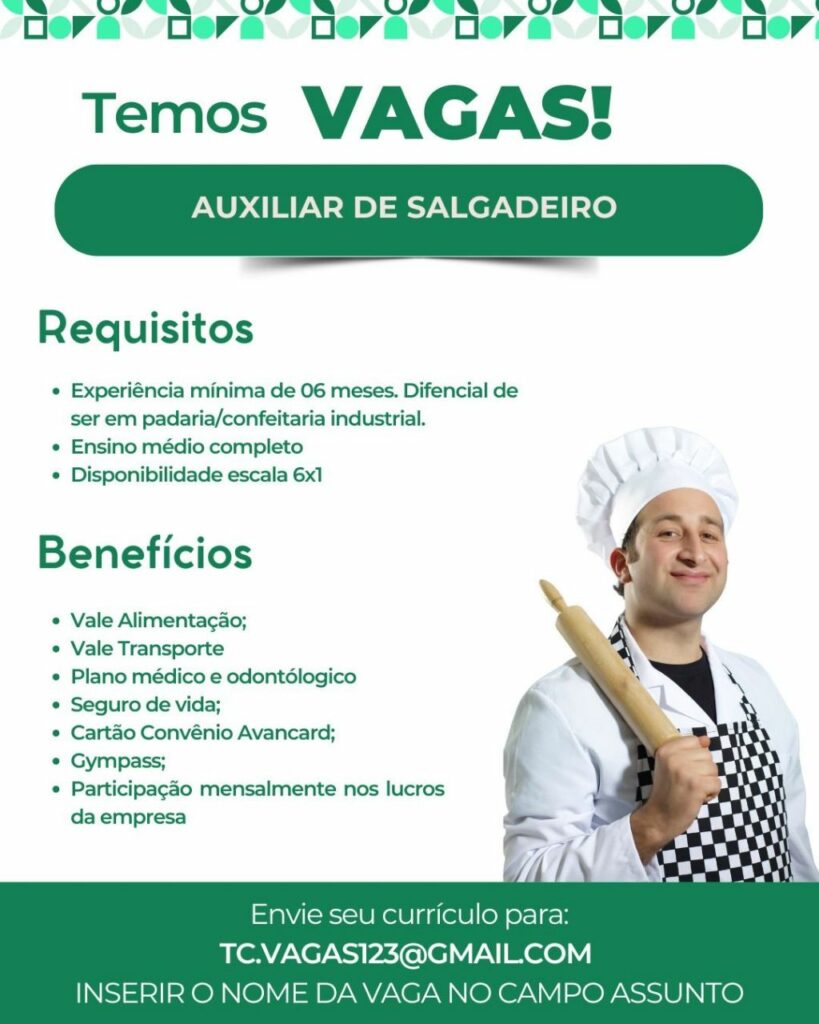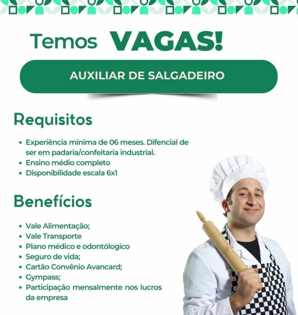 Empresa está selecionando Auxiliar de Salgadeiro; Envie seu currículo!