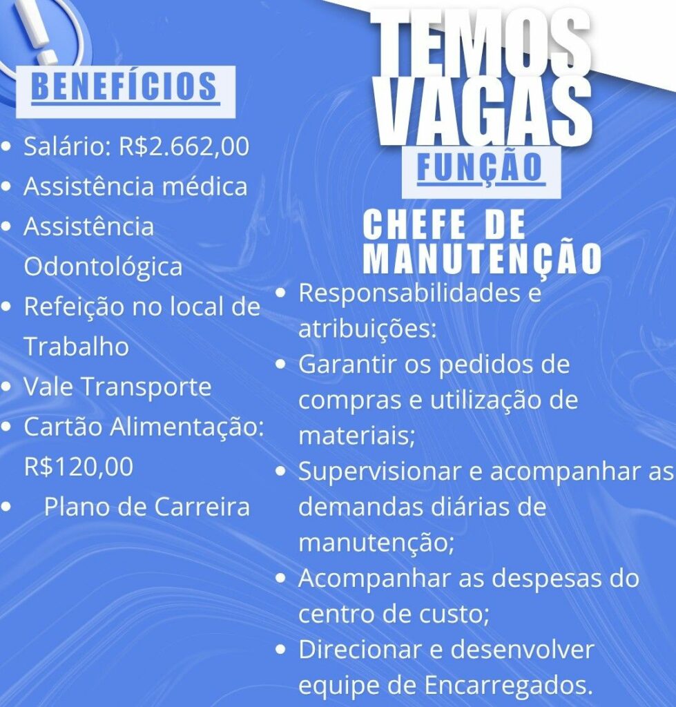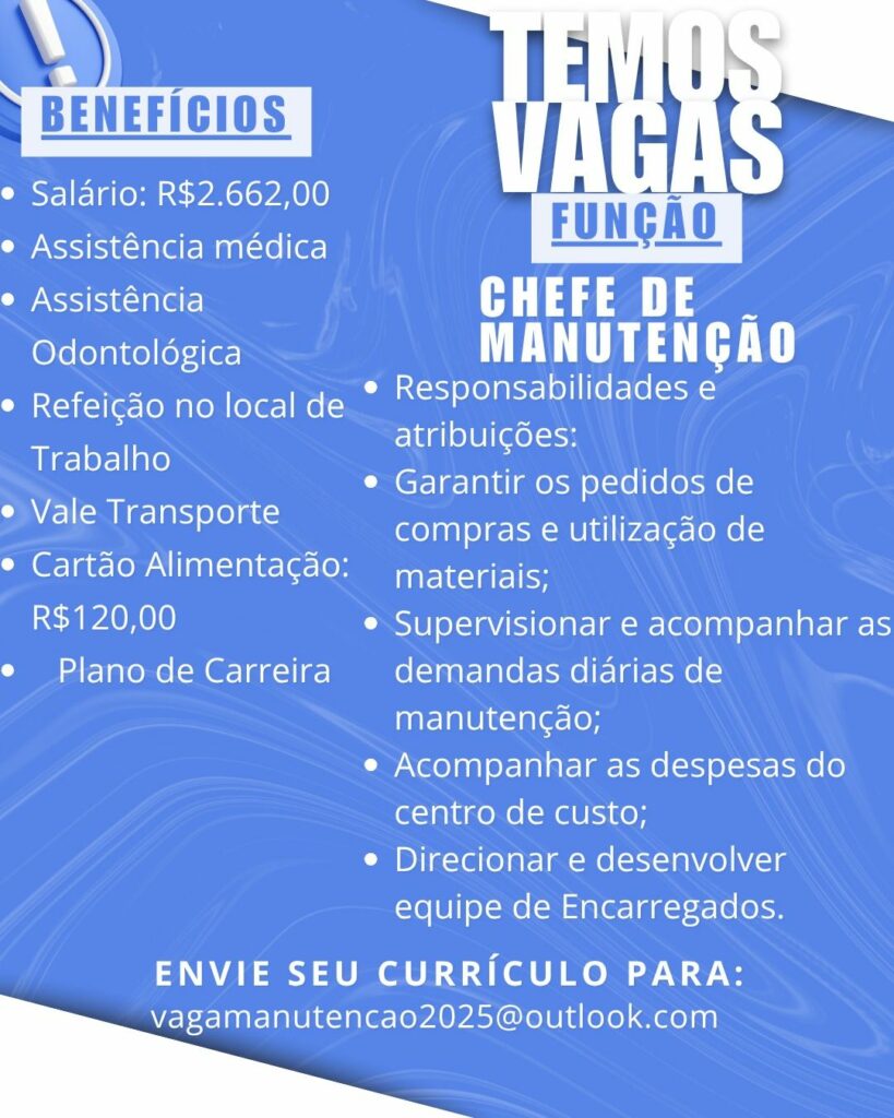 Empresa está selecionando Chefe de Manuntenção; Envie seu currículo!