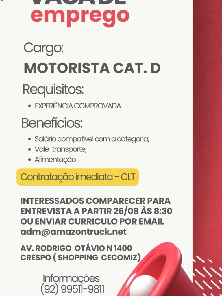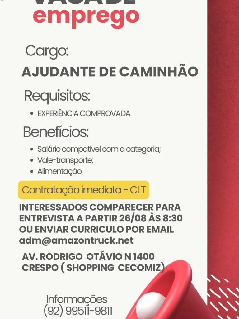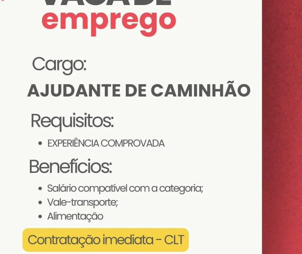 Seleção para seguintes vagas Vendedor (a), Carregador, Motorista, Serviços Gerais; Envie seu currículo!