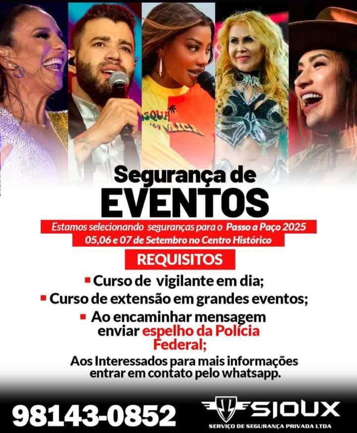 Empresa está selecionando Segurança de eventos; Envie seu currículo!