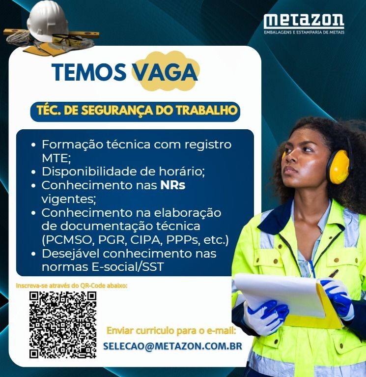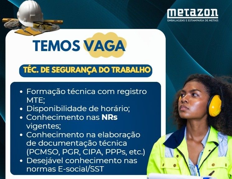 Empresa Metazon seleciona Téc de segurança do trabalho; Envie seu currículo!
