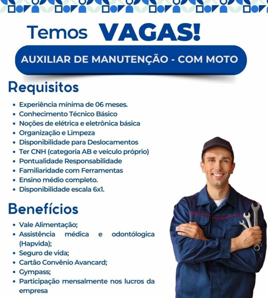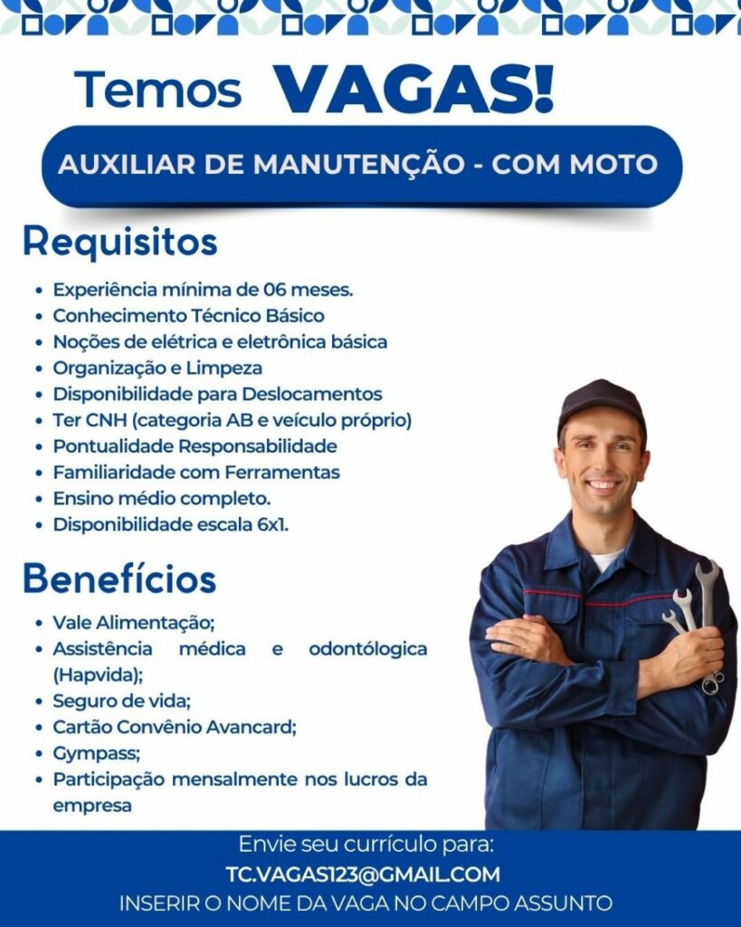 Empresa seleciona para vaga de Auxiliar de manutenção moto; Envie seu currículo!
