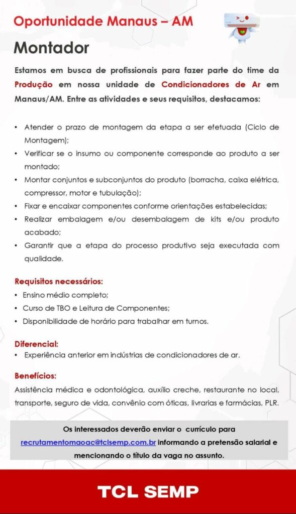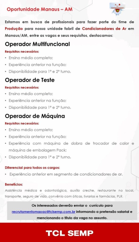 Empresa TCL Semp está selecionando Montador, Operador Multifuncional, Operador de Teste, Operador de máquina; Envie seu currículo!