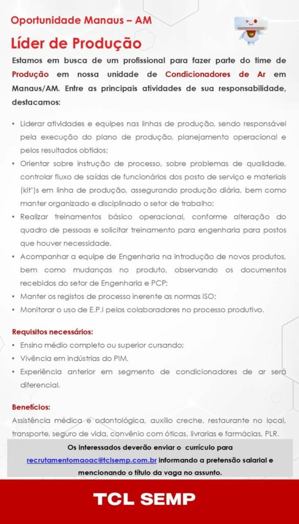 Empresa TCL Semp está selecionando para seu setor de produção; Envie seu currículo!