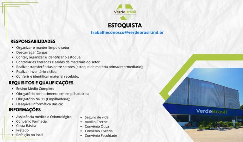 Empresa Verde Brasil seleciona Estoquista; Envie seu currículo!