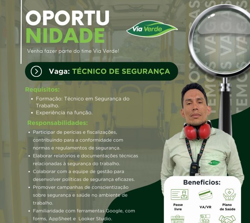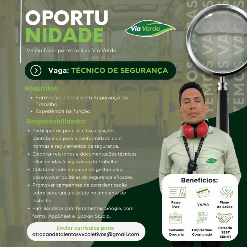 Empresa Via Verde está selecionando Técnico de segurança; Envie seu currículo!