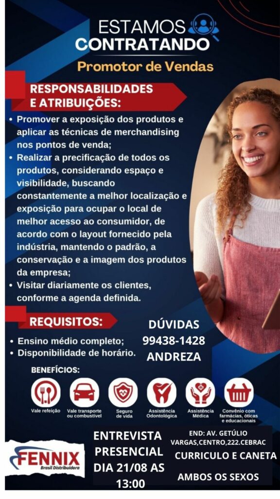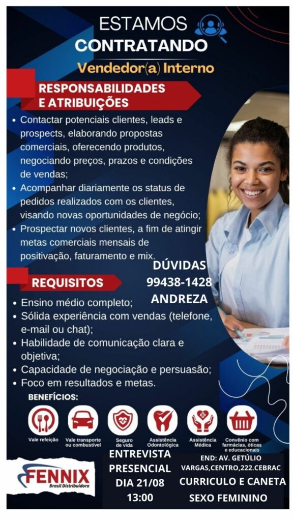 Fennix Distribuidora seleciona Vendedor (a) interno, Promotor de vendas; Envie seu currículo!