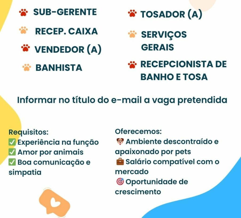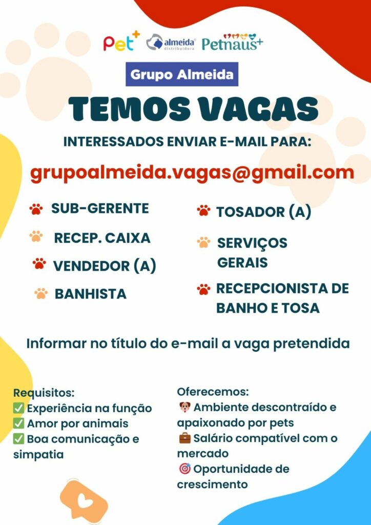 Grupo Almeida seleciona Subgerente, Recep. Caixa, Vendedor (a), Banhista, Tosador (a), Serviços Gerais, Recepcionista de banho e tosa ; Envie seu currículo!
