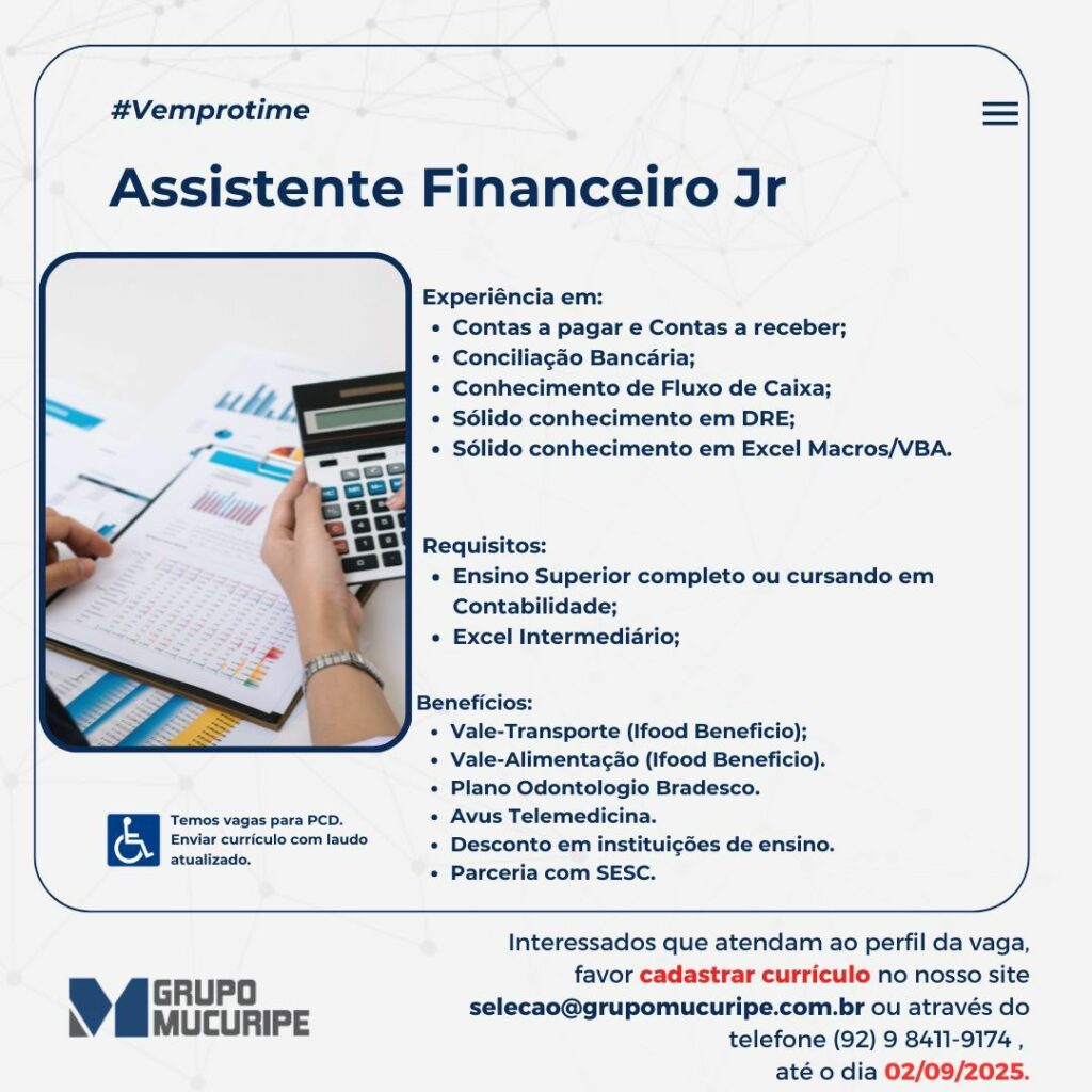 Grupo Mucuripe seleciona Assistente financeiro jr; Envie seu currículo!