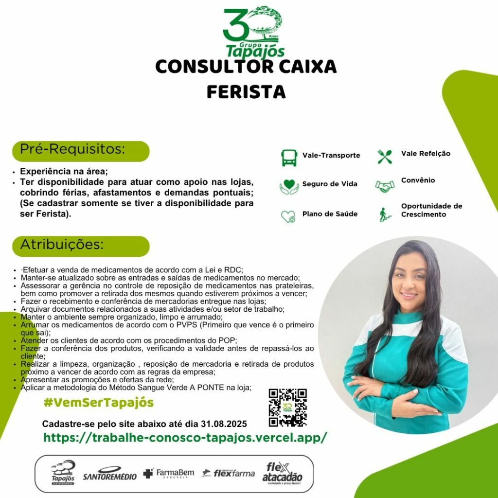 Grupo Tapajós está selecionando Consultor caixa ferista; Envie seu currículo!