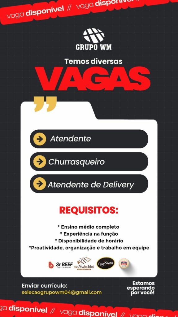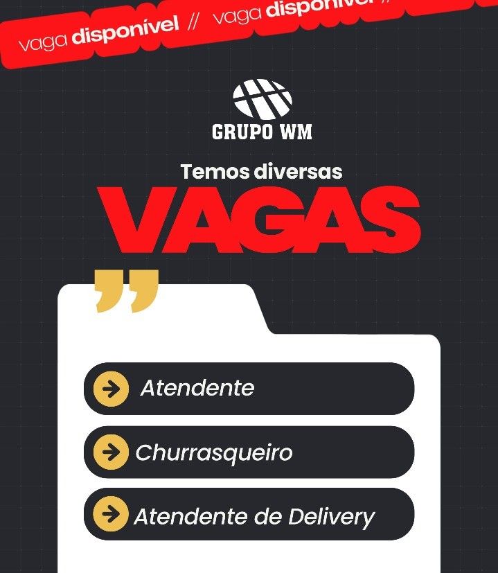 Grupo WM seleciona Atendente, Churrasqueiro, Atendente de delivery; Envie seu currículo!