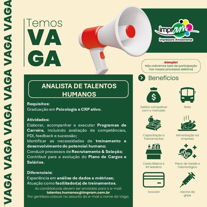Nunca pague qualquer quantia para participar de um processo para que seja selecionado. Não compre nenhum curso, apostilas ou serviços que prometem participação na seleção ou contratação de uma vaga. E nunca insira dados bancários, cartões ou envie documentos por e-mail ou através de sites que não reconhecem. Não nos responsabilizamos por nenhum tipo de pagamento efetuado.