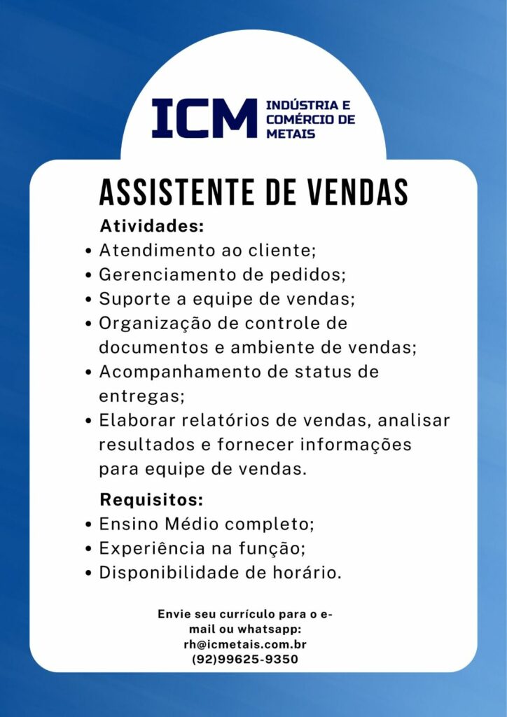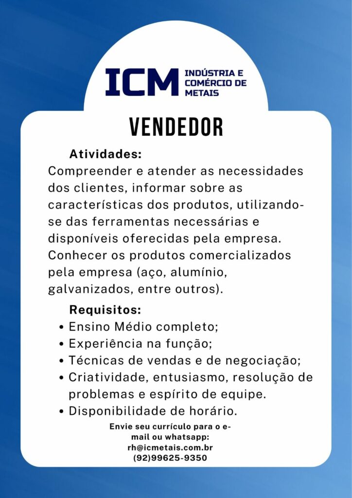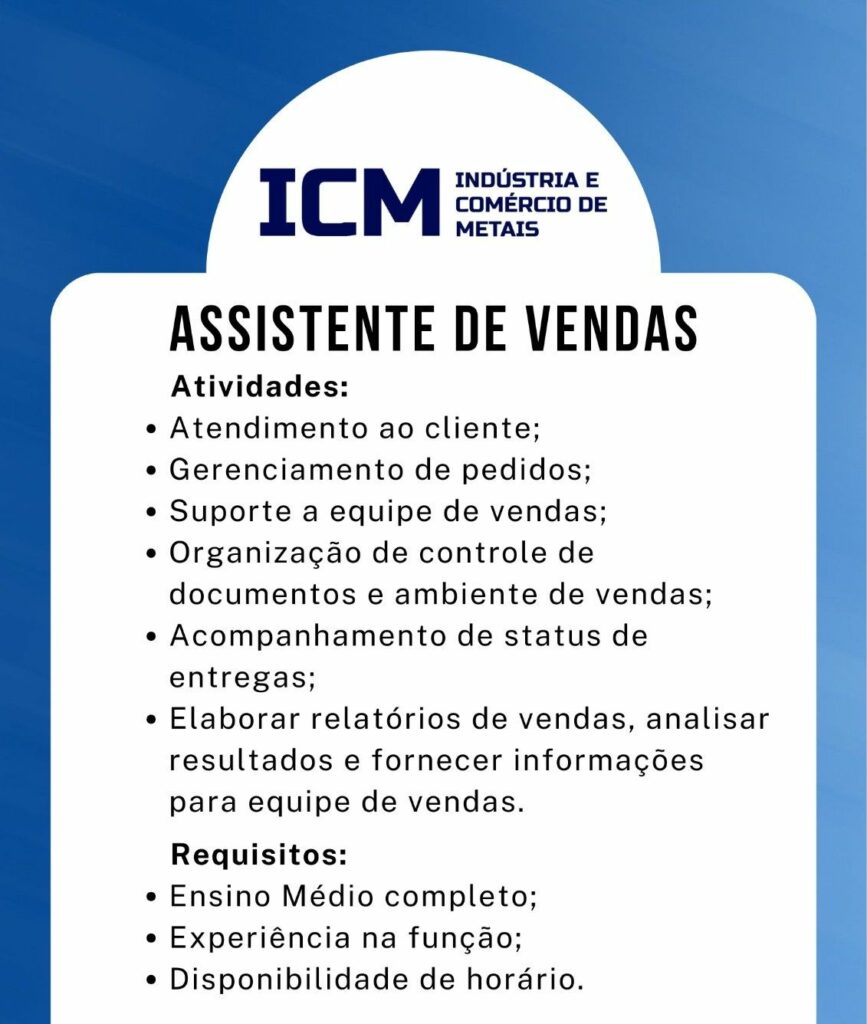 Indústria e comércio de metais seleciona Assistente de vendas, Vendedor; Envie seu currículo!