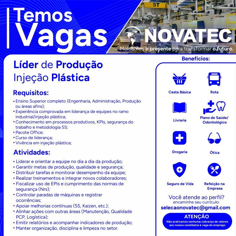Indústria Novatec está selecionando para seu setor de produção; Envie seu currículo!