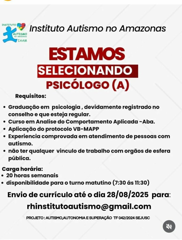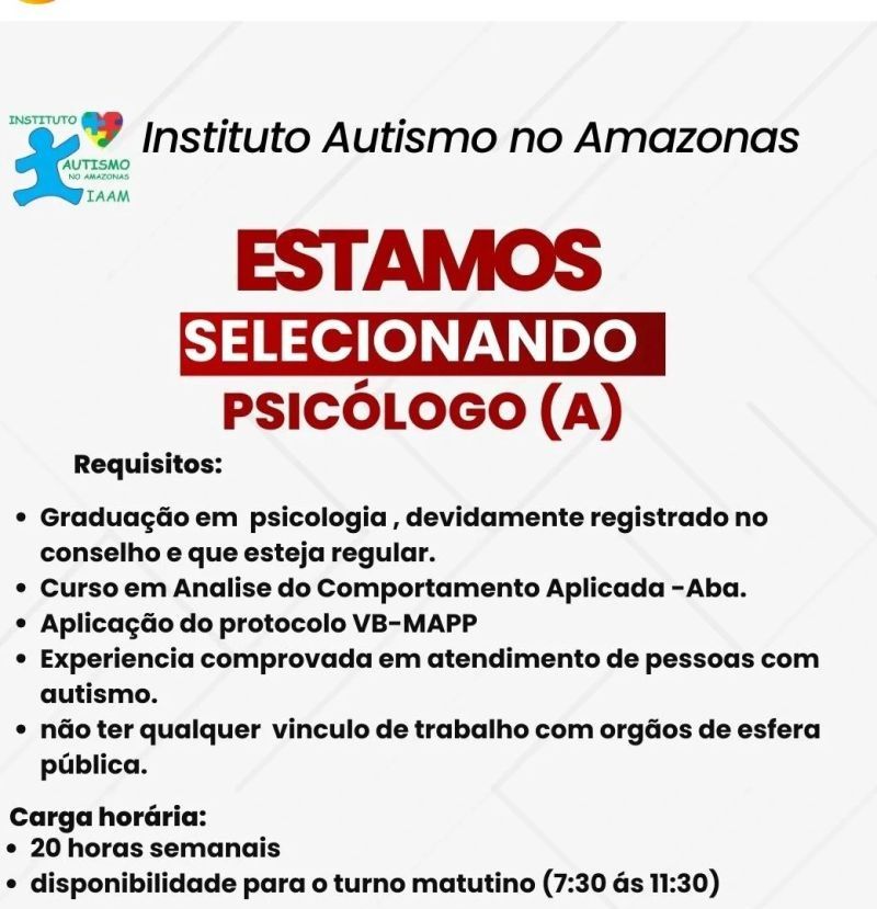 Instituto autismo no Amazonas seleciona psicólogo (a); Envie seu currículo!