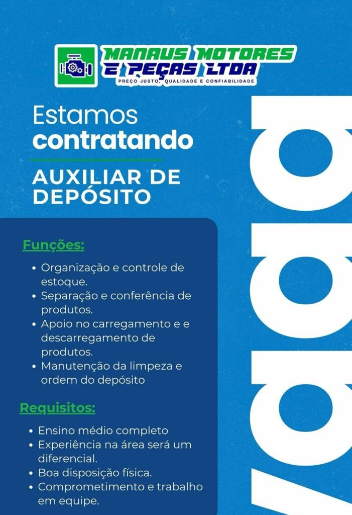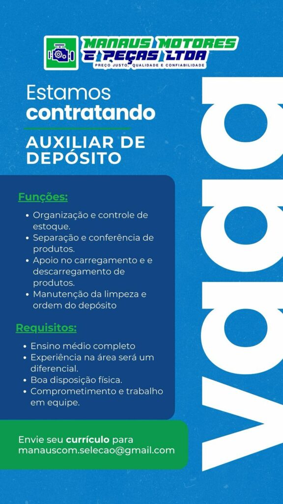 Manaus motores e peças Ltda seleciona Auxiliar de depósito; Envie seu currículo!