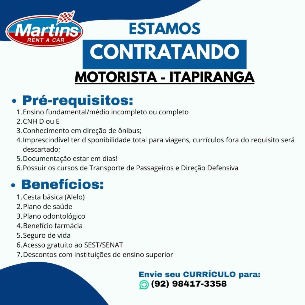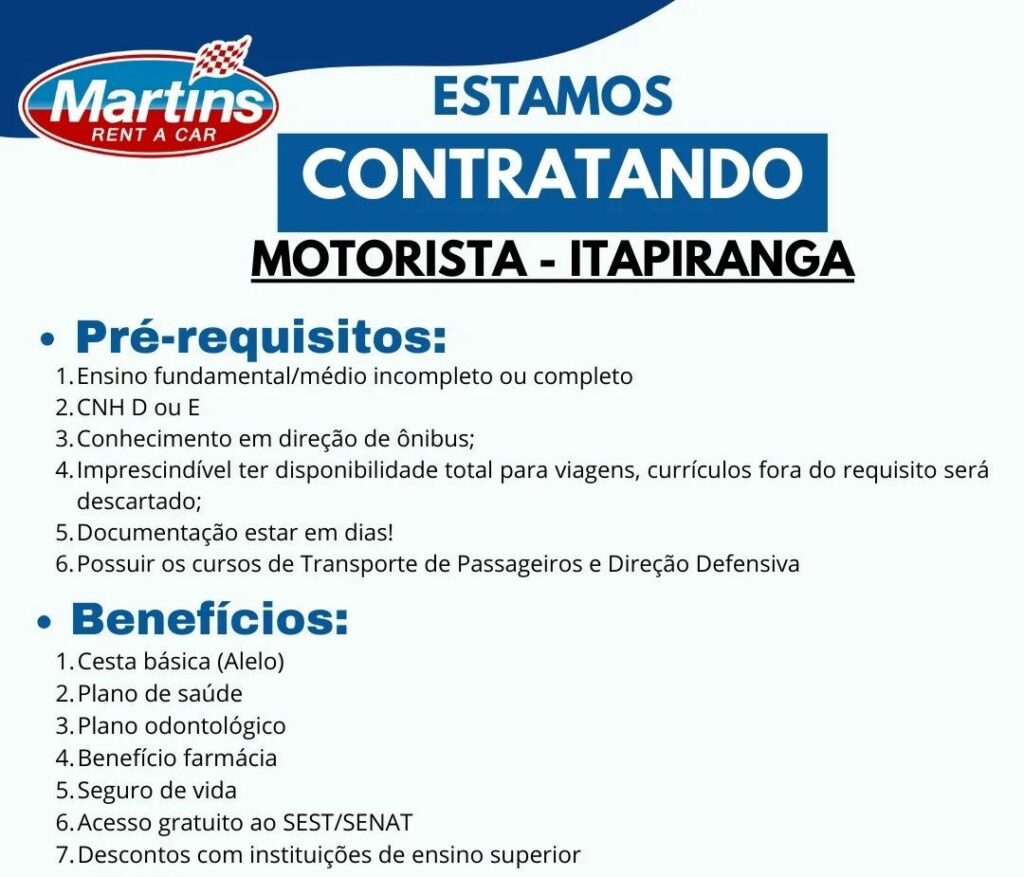 Martins rent a car seleciona Motorista; Envie seu currículo!