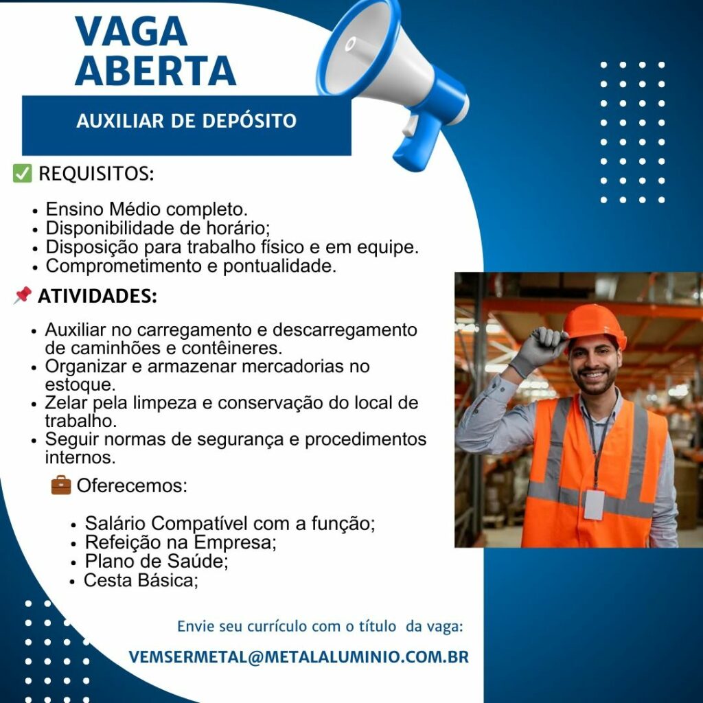 Metal Alumínio está selecionando Auxiliar de depósito; Envie seu currículo!