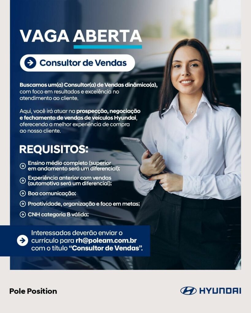 Pole position está selecionando Consultor de vendas; Envie seu currículo!