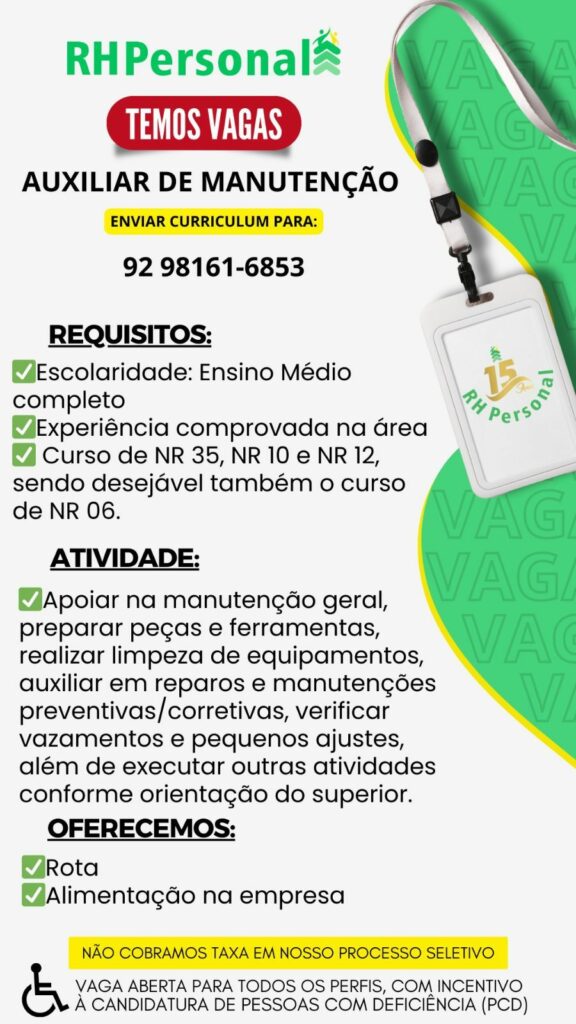 Rh está selecionando Auxiliar de Manuntenção, Analista de processo jr, Ajudante geral, Auxiliar de Manuntenção; Envie seu currículo!
