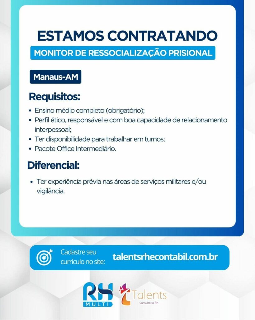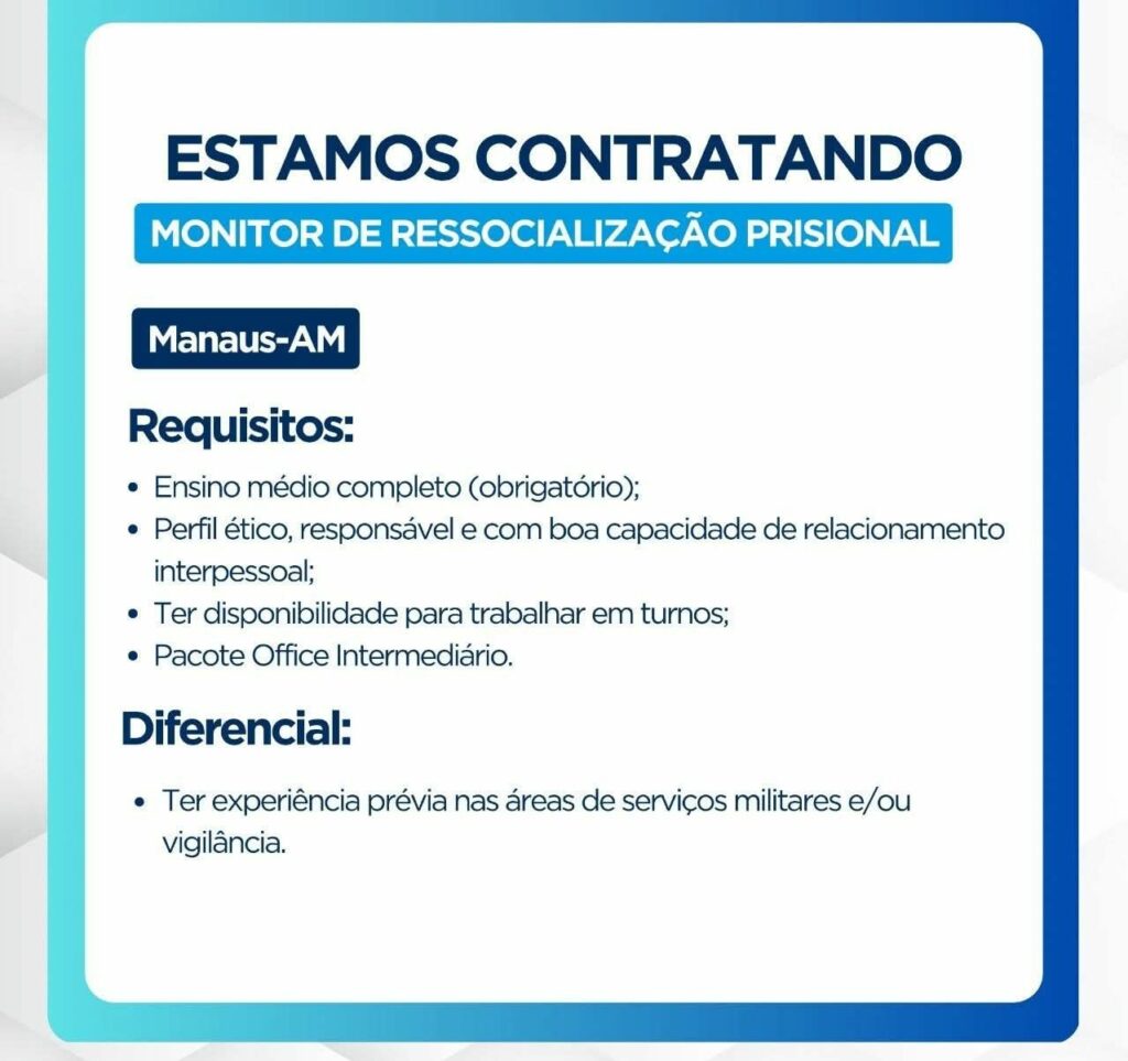 Rh está selecionando Monitor de ressocialização prisional; Envie seu currículo!