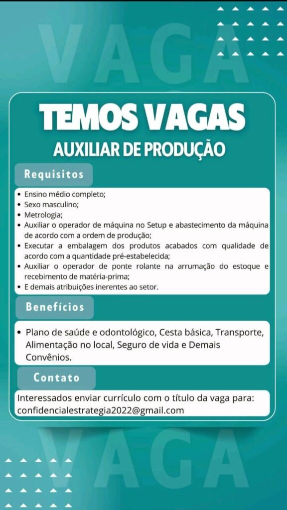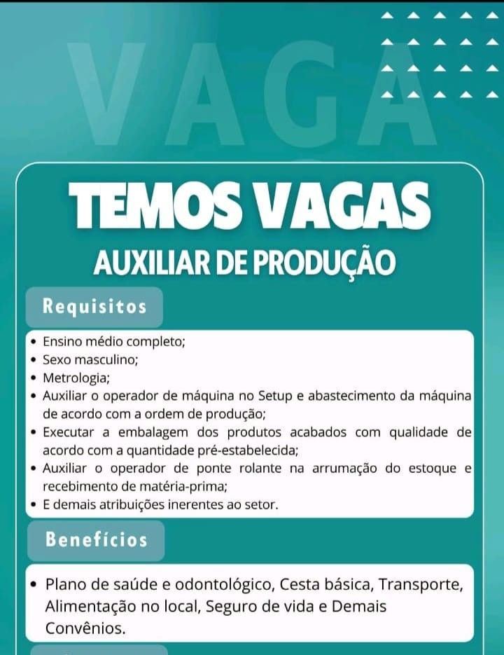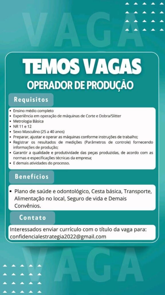 Rh está selecionando Operador de produção, Auxiliar de produção; Envie seu currículo!