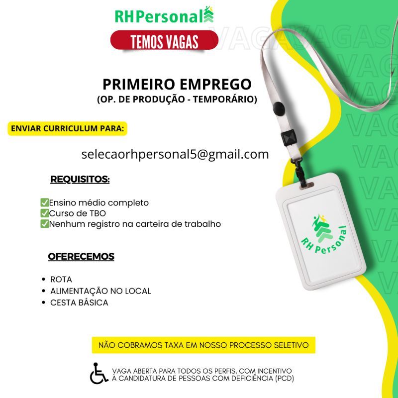Rh está selecionando Operador de produção primeiro emprego; Envie seu currículo!