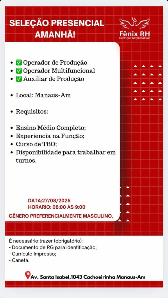 Rh fênix está selecionando Auxiliar de produção, Operador de produção, Operador Multifuncional; Envie seu currículo!