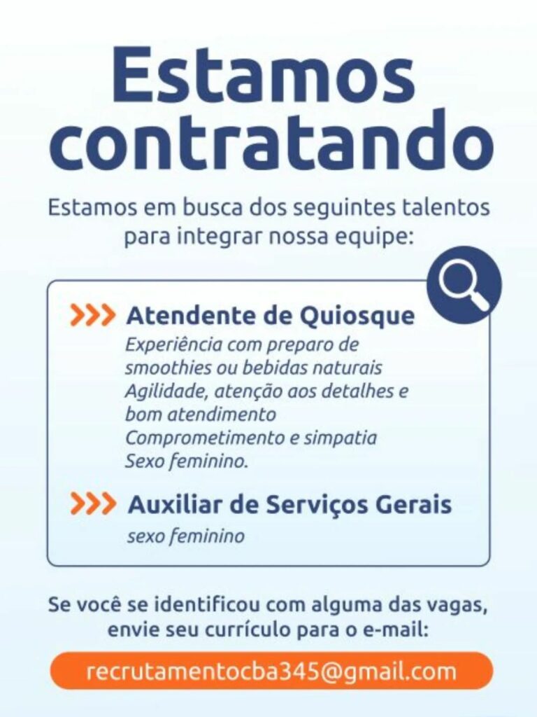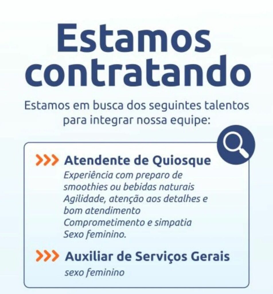 Seleção para seguintes vagas Atendente de quiosque, Auxiliar de serviços gerais; Envie seu currículo!