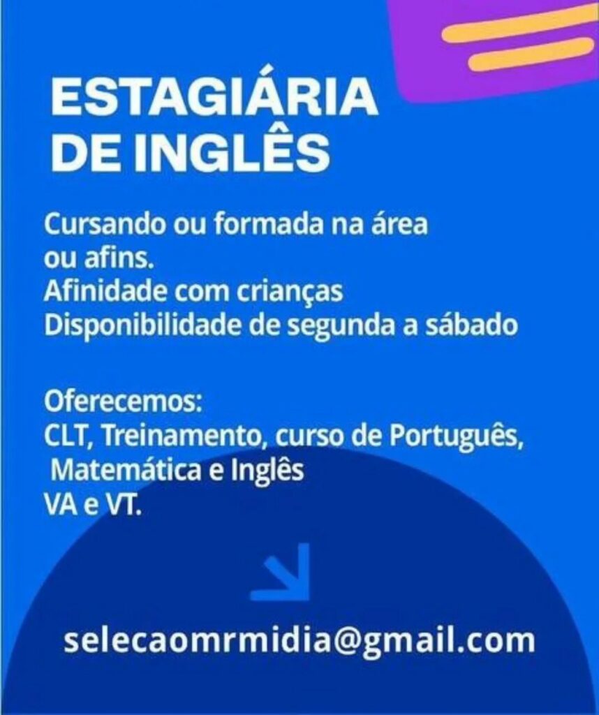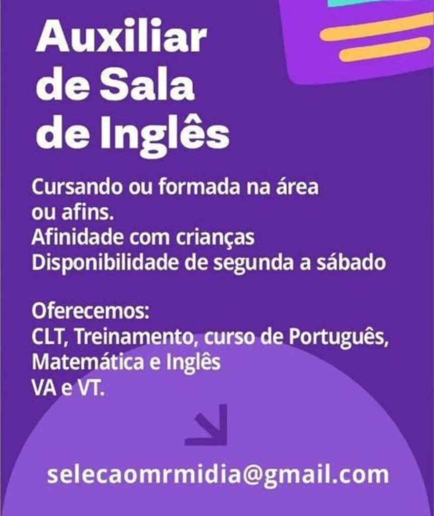 Seleção para seguintes vagas Auxiliar de sala de inglês, Estagiária de inglês; Envie seu currículo!