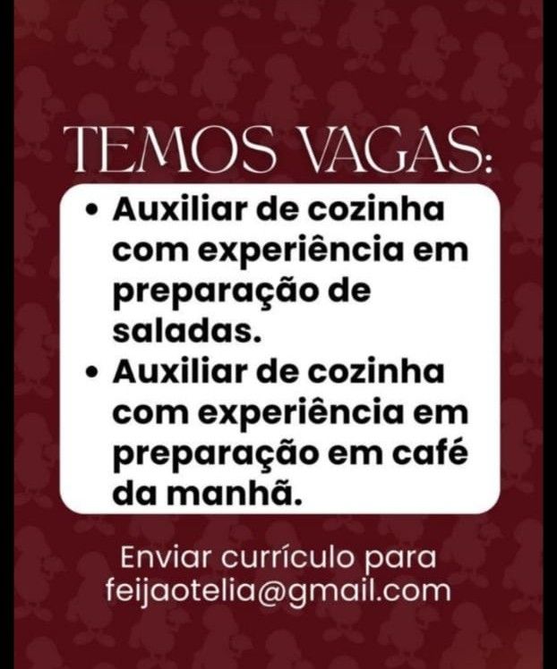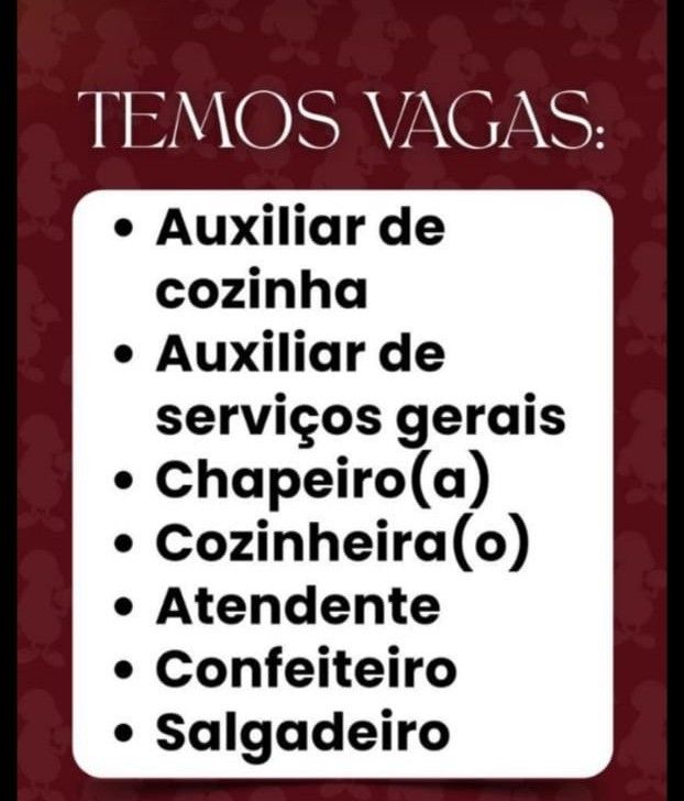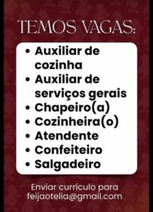 Seleção para seguintes vagas Auxiliares de cozinha, Auxiliar de serviços gerais, Chapeiro (a), Cozinheira (o), Atendente, Confeiteiro, Salgadeiro; Envie seu currículo!