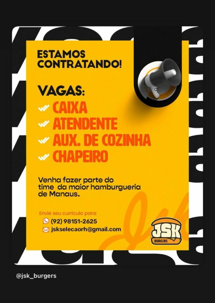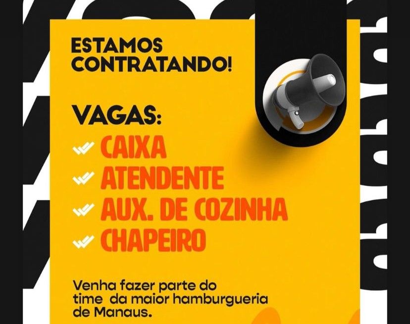Seleção para seguintes vagas Caixa Atendente, Auxiliar de cozinha, Chapeiro; Envie seu currículo!