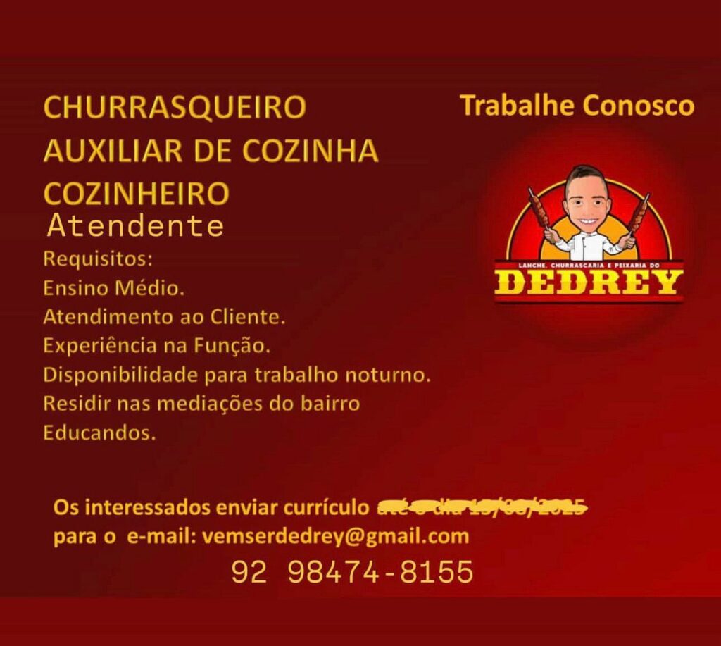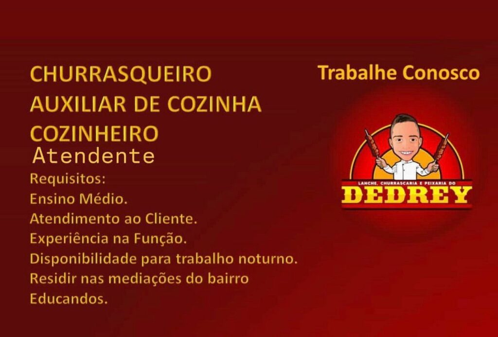 Seleção para seguintes vagas Churrasqueiro, Auxiliar de cozinha, Cozinheiro, Atendente; Envie seu currículo!