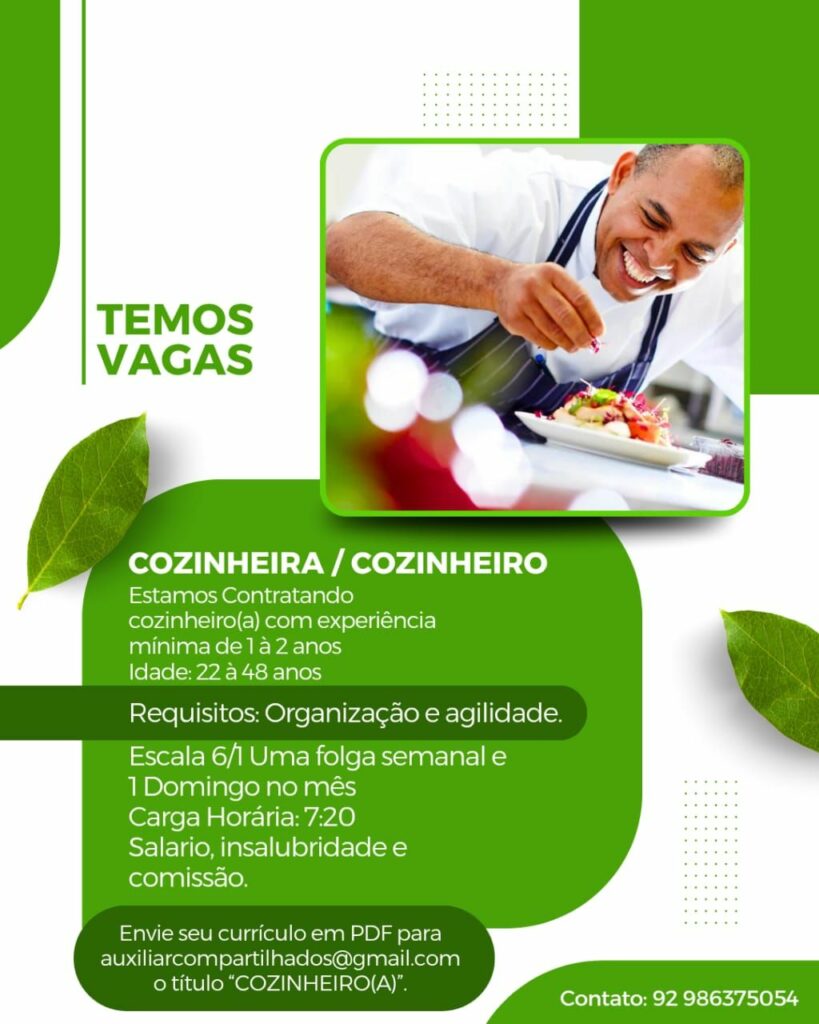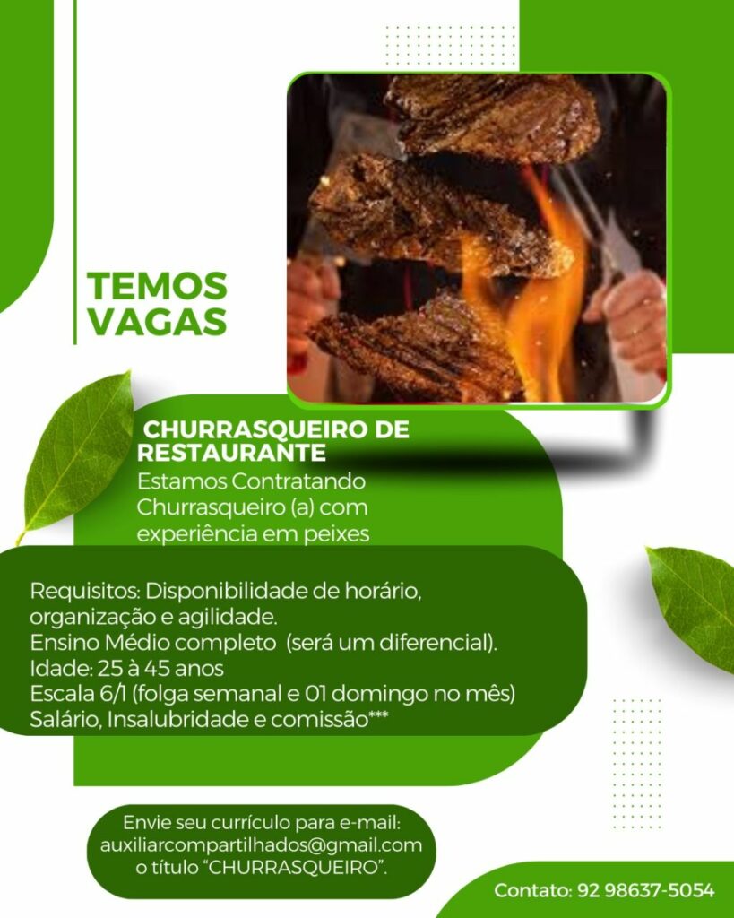 Seleção para seguintes vagas Churrasqueiro de restaurante, Cozinheira (o); Envie seu currículo!