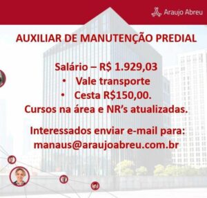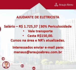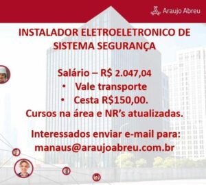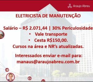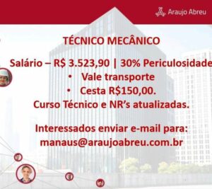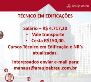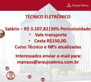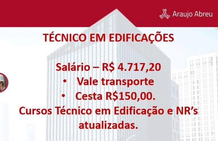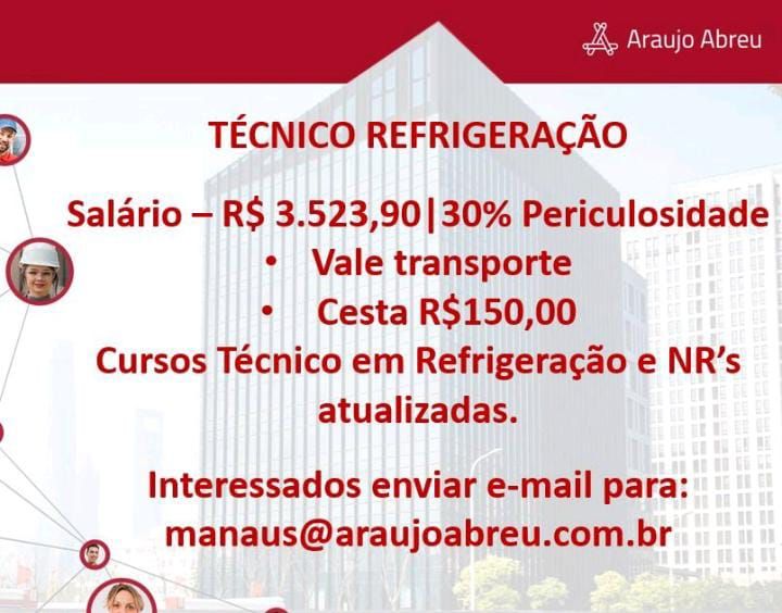 Seleção para seguintes vagas Técnico Refrigeração, Eletrotécnico, Técnico em Edificações, Instalador Eletroeletrônico de sistema de segurança, Auxiliar de manutenção predial, Técnico mecânico, Ajudante de eletricista, Eletricista de Manuntenção, Técnico eletrônico; Envie seu currículo!