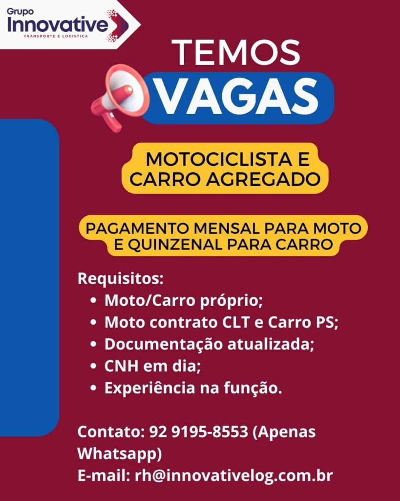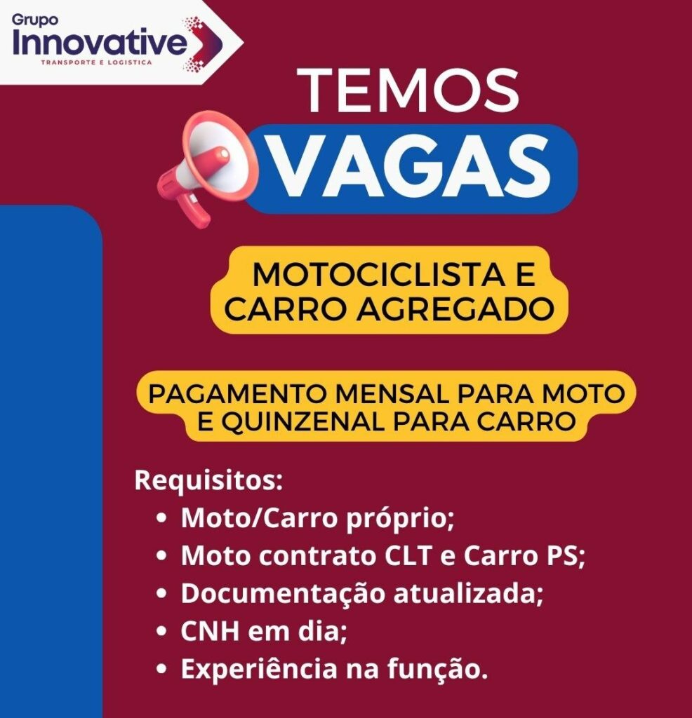 Seleção para vaga de Motociclista e carro agregado ; Envie seu currículo!