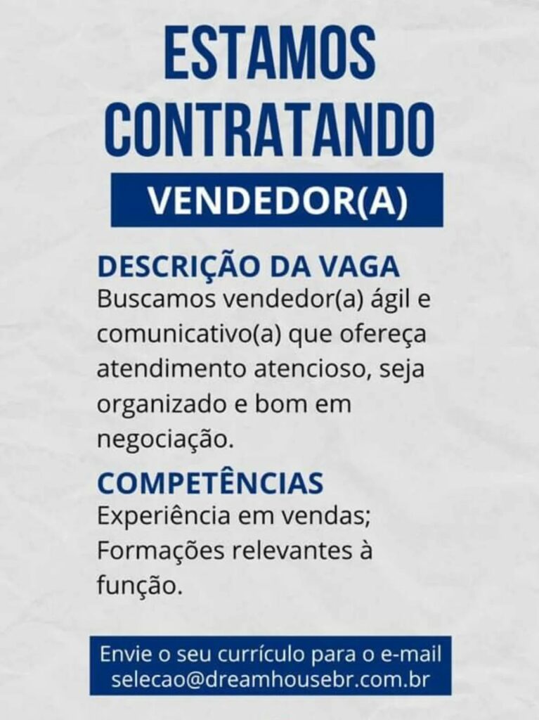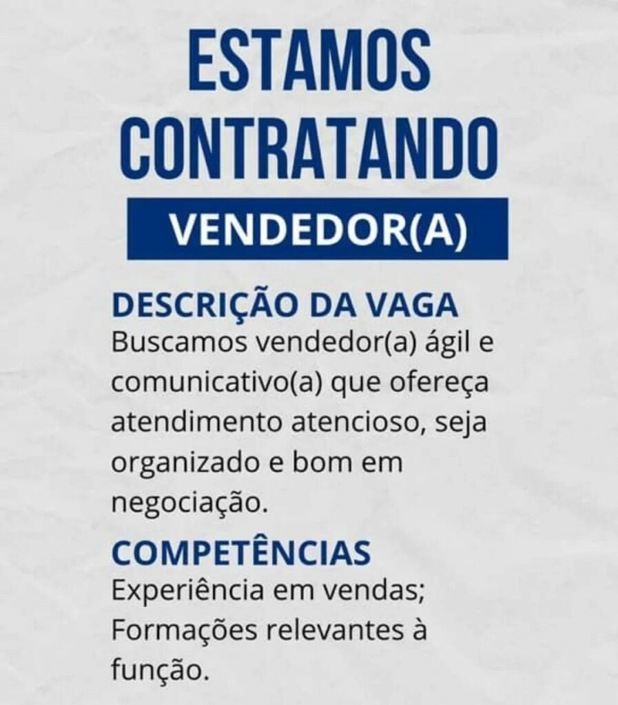 Seleção para vaga de Vendedor (a); Envie seu currículo!