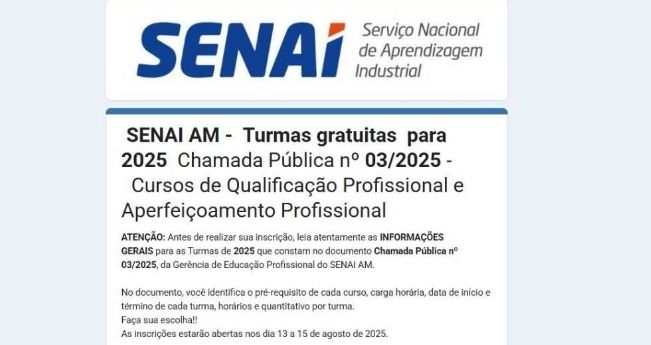 Enfim, os cursos presenciais serão realizados com todas as medidas e protocolos de saúde e segurança em combate e prevenção ao Covid-19, e também com acessibilidade às pessoas com deficiência. Contudo, os prazos e procedimentos estabelecidos na chamada, assim como suas eventuais alterações e demais procedimentos devem ser divulgados nas redes sociais do Senai Amazonas.